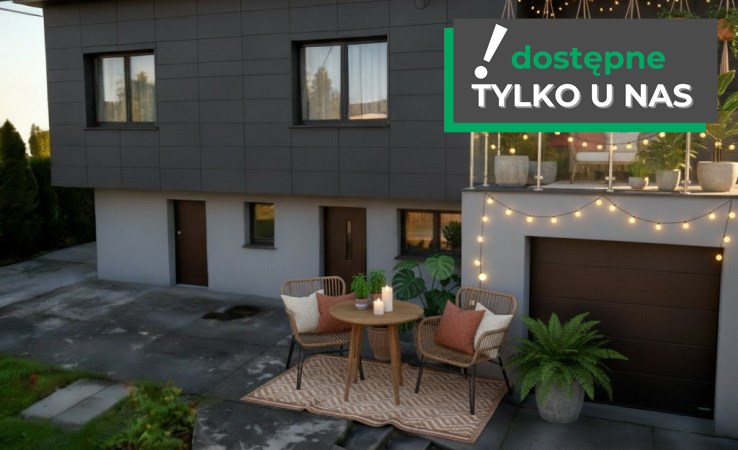 - Zadaszone tarasy: z przodu i z tyłu domu