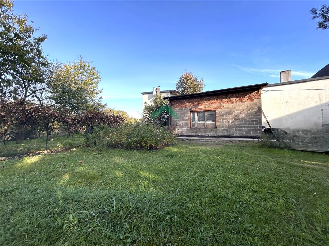 - Murowany budynek gospodarczo-garażowy (ok. 34 m²) z nowym dachem (papa wymieniona rok temu), strych