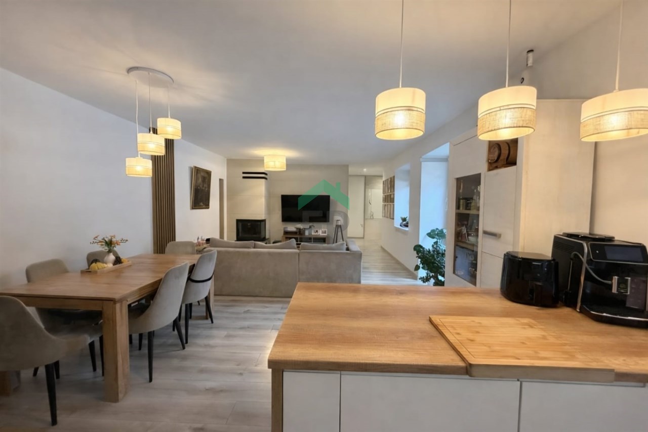 - Salon z kominkiem połączony z aneksem kuchennym,
